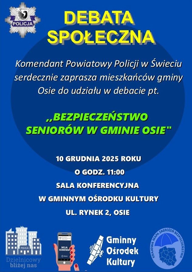 Komendant Powiatowy Policji w Świeciu zaprasza mieszkańców gminy Osie na debatę społeczną poświęconą bezpieczeństwu osób starszych. Spotkanie odbędzie się 10 grudnia 2025 o godzinie 11:00 w sali konferencyjnej Gminnego Ośrodka Kultury w Osiu.